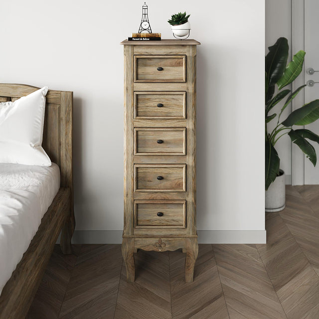 This solid rustic mango wood chest is perfect for keeping your belongings organized. It features five drawers and a contemporary French style with a grey washed finish. It is the ideal addition to any narrow space. Enjoy its intricate detailing and unique contours that add a touch of charm to any room.