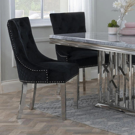 Lion Knocker Back Dining Chair - Black Velvet Fabric - Chrome Legs
