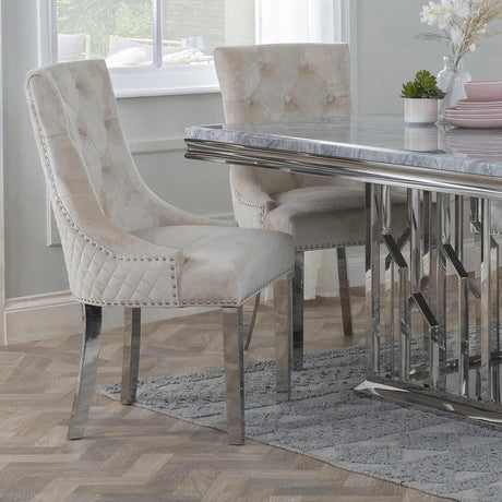 Lion Knocker Back Dining Chair - Champagne Velvet Fabric - Chrome Legs