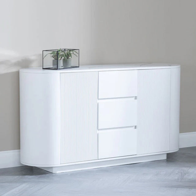 This Pavia sideboard boasts a stunning white marble effect with curved fluted details, adding a touch of luxury to any living space. Its sleek design offers both style and functionality, providing ample storage space for your belongings. Elevate your home with this elegant and sophisticated piece.