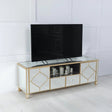 This stunning media unit is sure to stand out in your home. Featuring mirrored finish with gold trim, two doors and two drawers, with ample media storage space, it will make a functional and glamorous feature in any living room. Add a touch of luxe to your living area!