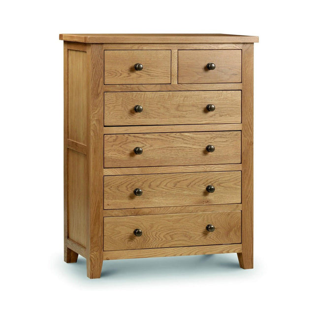 This waxed oak wide chest is perfect for you to store your items and add a stylish look to the room. It has 4 large drawers and 2 small drawers with easy-glide metal runners. The rounded edges and classic design make it a timeless piece of furniture. Assembly is already done, making it easy to enjoy your new chest.