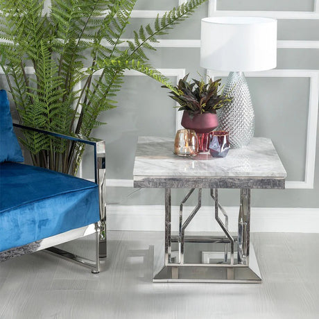 Verona Grey Marble and Chrome Side Table with Artistic Base